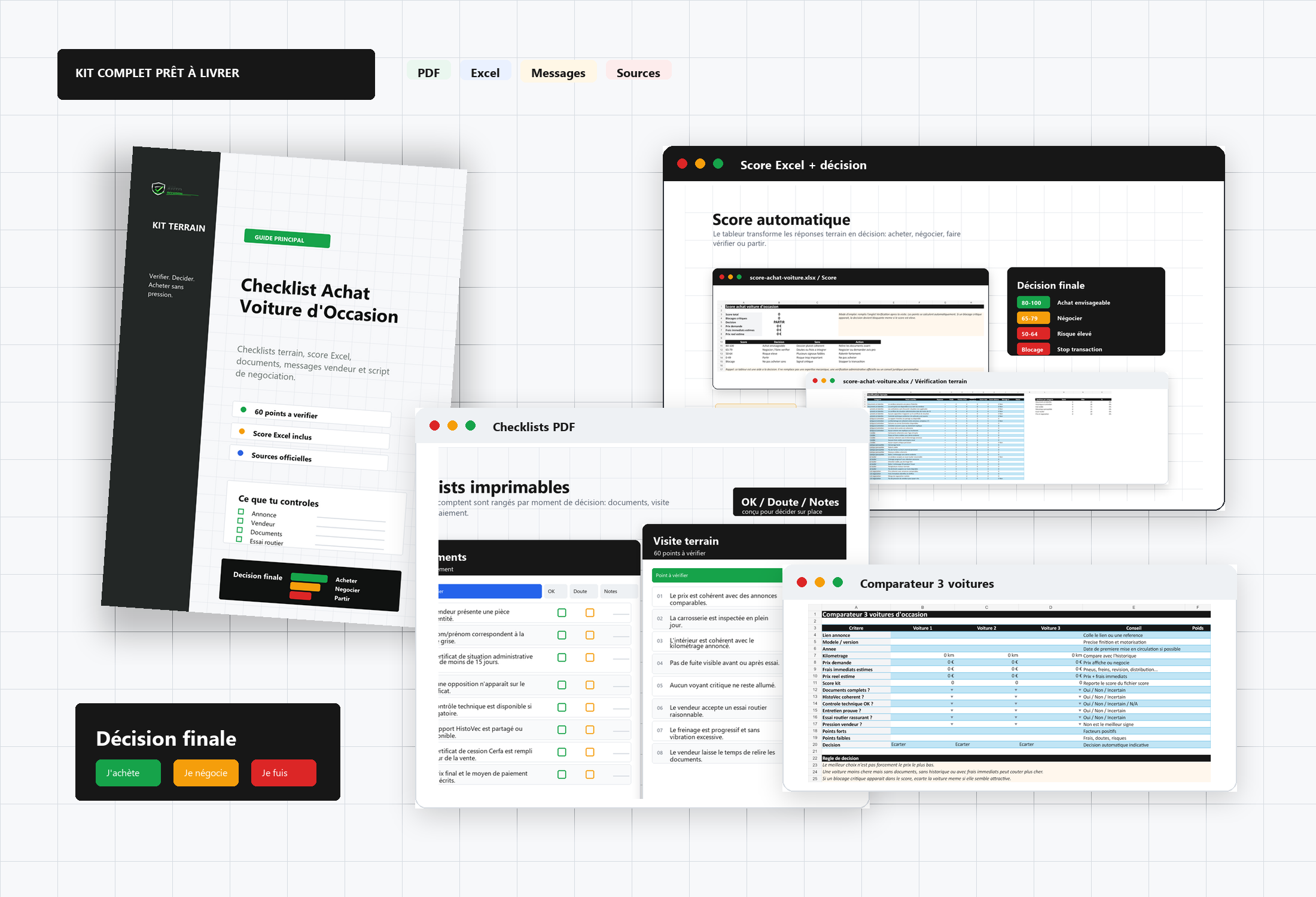 Le kit ne garantit pas une voiture parfaite. Il aide à réduire les oublis, poser les bonnes questions et éviter de payer avant les vérifications essentielles.