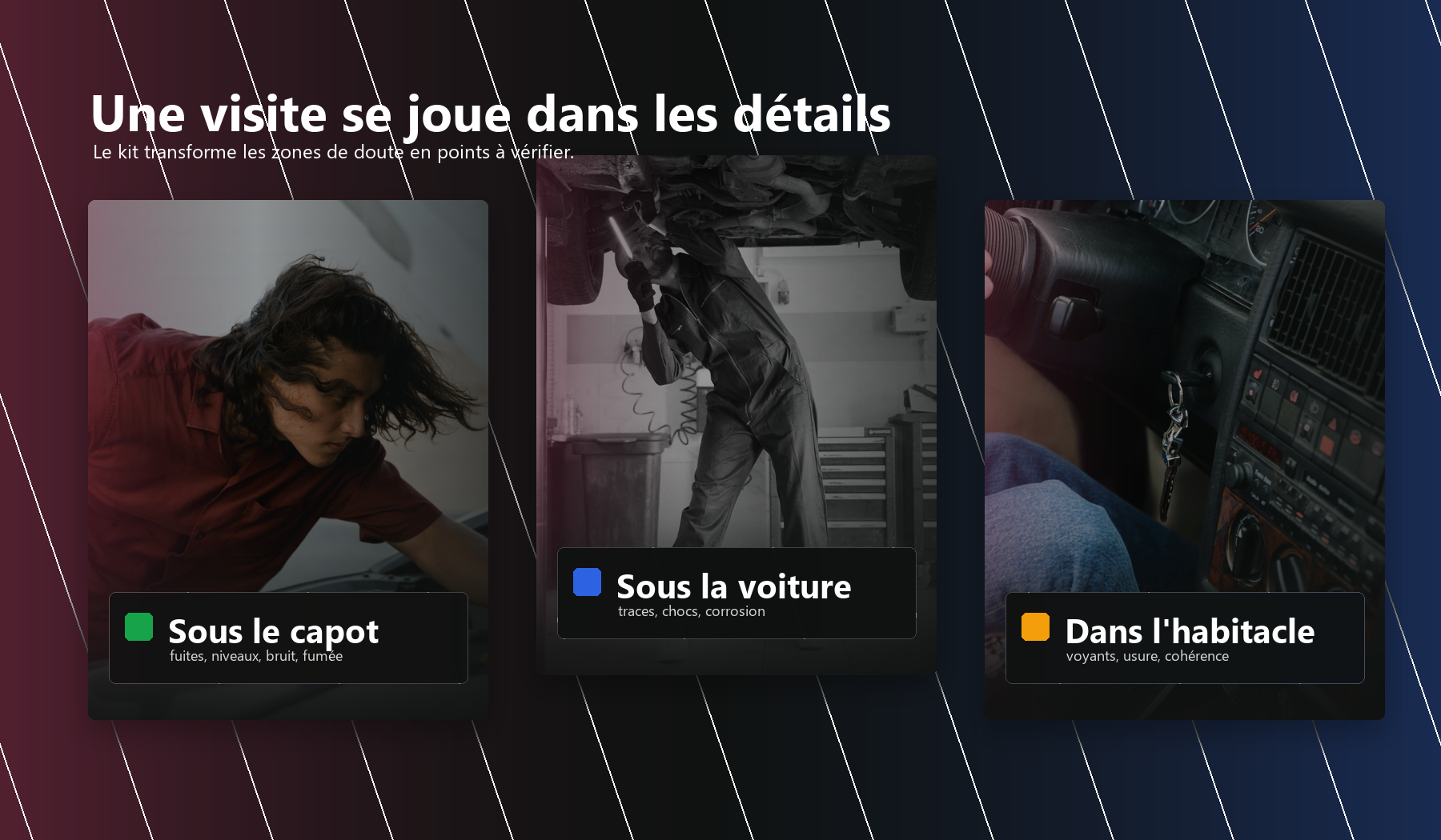 Le kit transforme les zones de doute en points simples à vérifier : documents, carrosserie, habitacle, essai routier, comportement du vendeur et frais visibles.